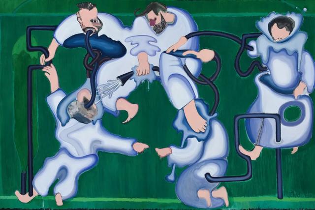 进走廊,第一件作品就有3米长、2米高。80后的武晨在这幅画里,重新演绎了野兽派画家马蒂斯的《舞蹈》,只是场景变成了2014年世界杯上梅西被四个德国队员围堵的瞬间,球门成了软管,把五个人连了起来。