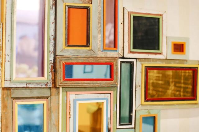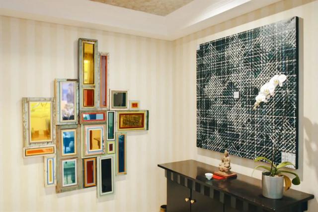 玄关另一侧的墙上,是北京艺术家宋冬用回收来的旧木窗和镜子做的一人高的装置,和旁边的穿衣镜放在一块儿,亮眼又不突兀。