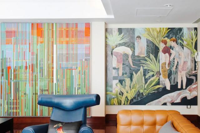 和关东元聊怎么规划收藏的资金、购买艺术品能不能升值,关东元笑着指墙上刘韡和美国当红艺术家赫尔南·巴斯(Hernan Bas)的作品: