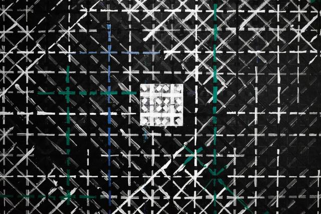 粗看觉得只是黑底白线条,走近发现里面还有蓝绿色的丰富层次。把画放这里,关东元给家定了个厚重、沉稳又多彩的基调。