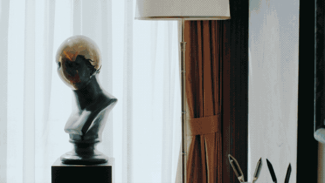 杨茂源的青铜雕塑,原型是维纳斯女神头像,部分脸庞反复打磨后,像黄金一样闪耀。之前关东元觉得能从一个西方的雕塑照出自己东方人的脸,挺有意思;今年再看,发现维纳斯像戴着口罩、经历疫情的感觉;
