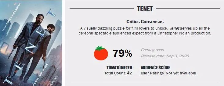 目前,《信条》烂番茄新鲜度为79%,在42个专业媒体评价中,33个给出了好评。