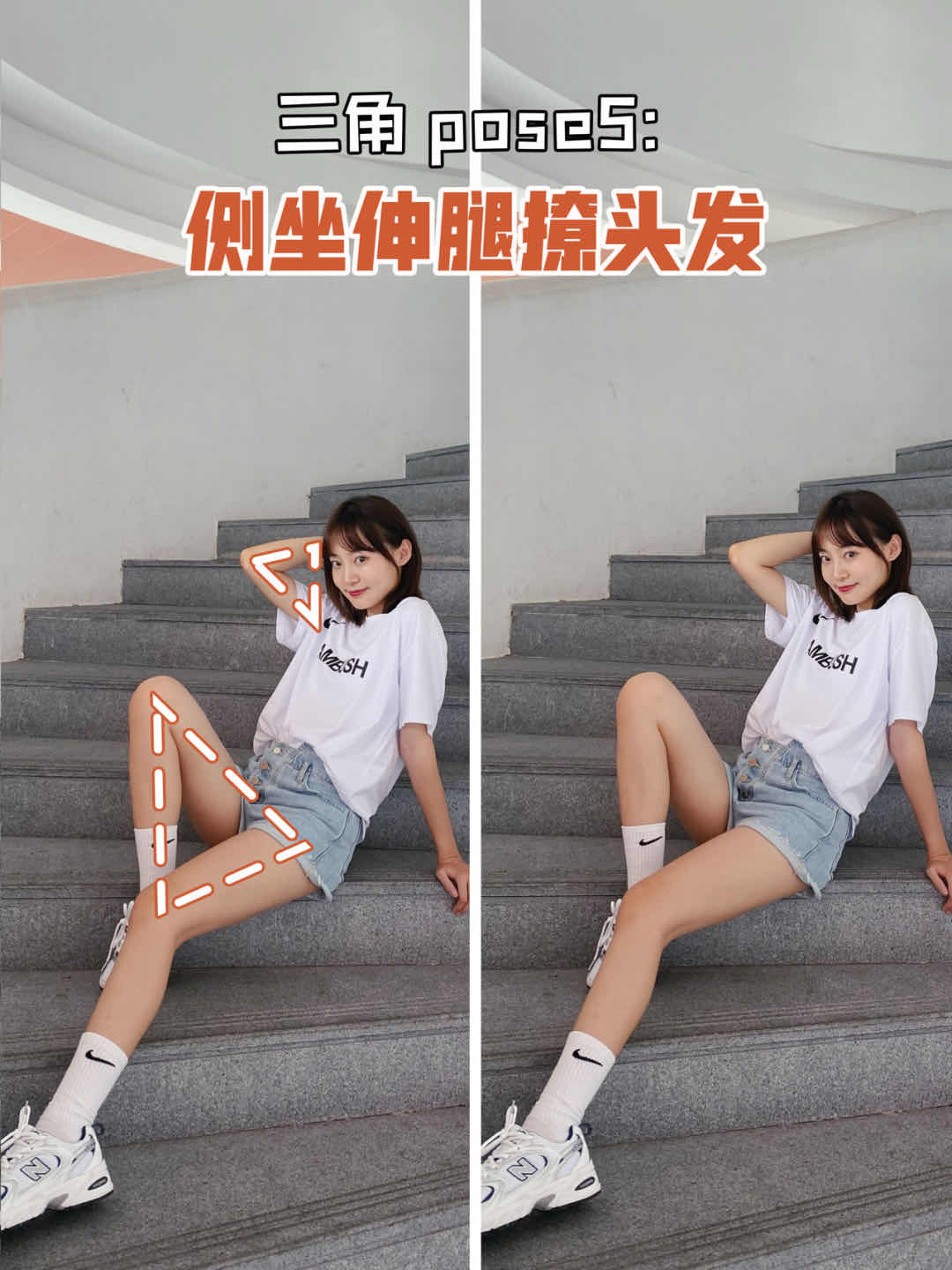 除了正对镜头向前伸腿,侧身伸腿的姿势更适合腿不那么长的女生,在拍摄时将腿放于画面的对角线上,再配合上一个撩头发的姿势,既能拍出魅力感又能显腿长,简单实用。