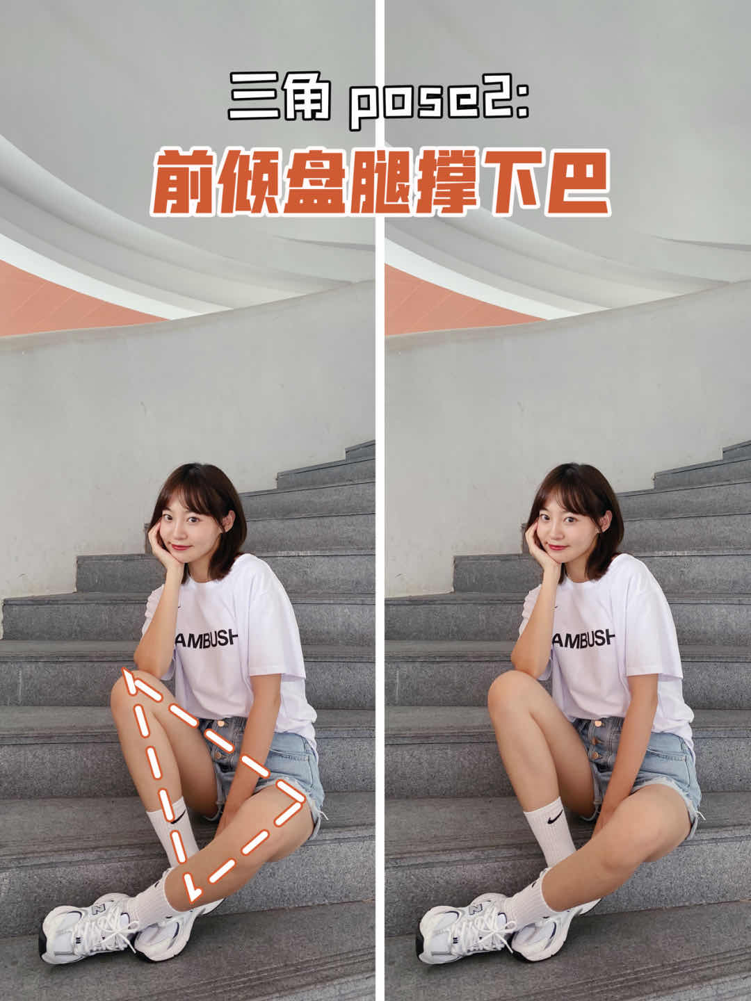错落的阶梯要好好利用起来,为了摆出更多的三角形曲线,可以像下面的女生一样,侧身蹲下,一手叉腰,一脚跪地,利用阶梯避免身体的过多重叠,从而起到显瘦的作用,拍照又美又酷。