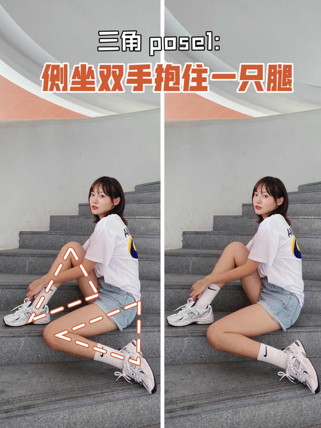 正面镜头如果角度把控不好很容易显胖不上镜,在楼梯拍照时,你可以稍微侧身坐下,一脚弯曲起来,一脚向下弯曲,再用手抱膝,拍照又酷又好看。