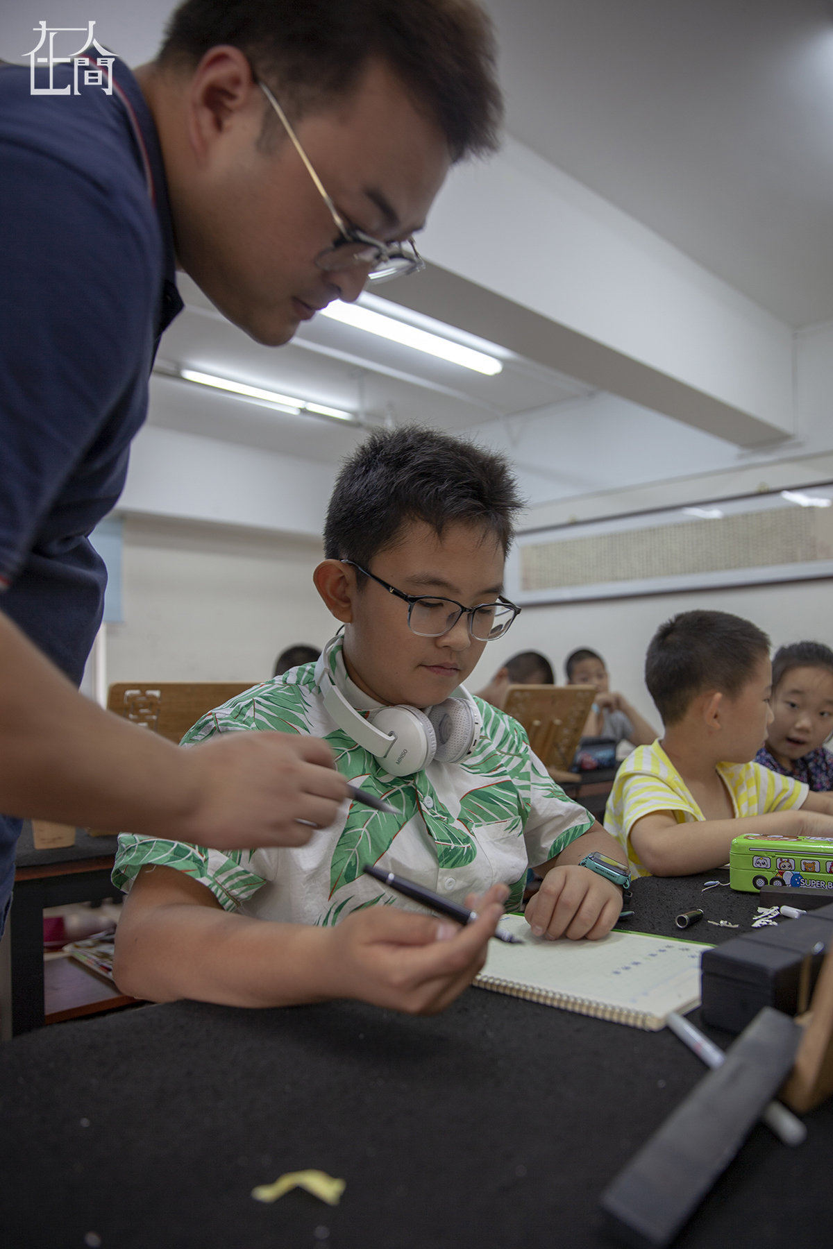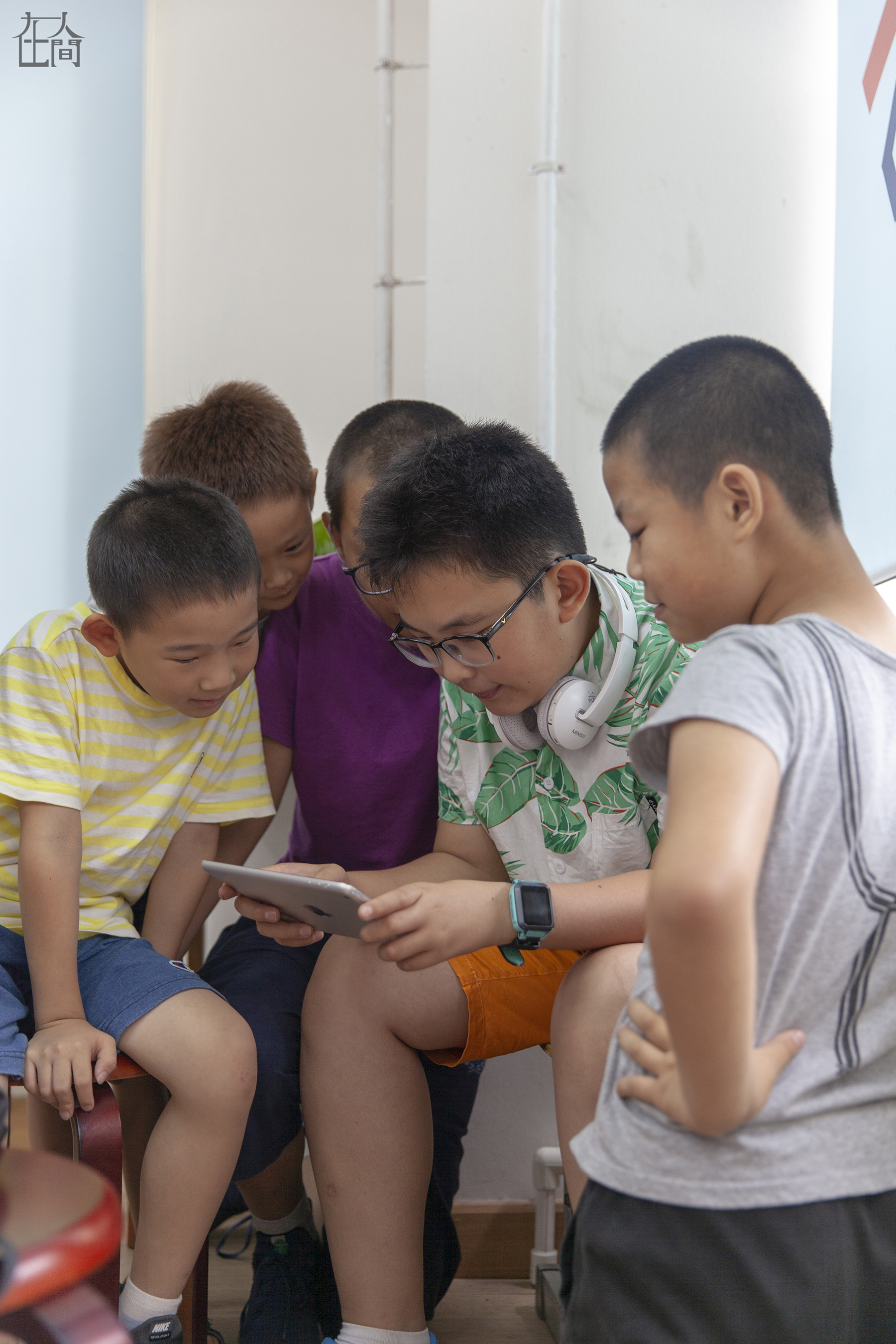 朗朗的数学,校校的书法,Lucas的足球都下课了,他们终于可以有一段完全属于自己的午休时间。打游戏、看视频是他们最热衷的消遣方式,除此之外一句话都不愿多说,好像所有的精气神儿都被吸进了面前的电子产品中。图为2019年7月22日,书法课休息期间,校校在玩儿老师的Ipad。