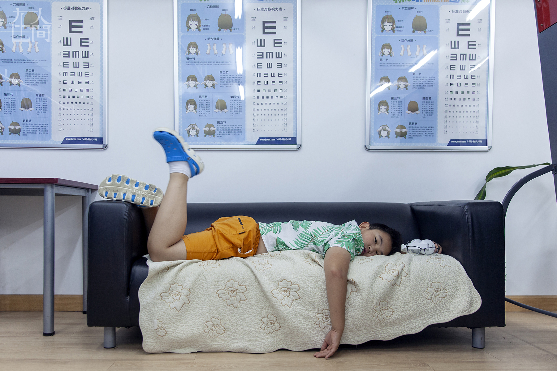 今年暑假校校和妈妈协商,7月抓紧学习,各种课程集中排在7月,8月真正放假、旅游,自己安排时间。图为2019年7月22日,在补习班课间,校校趴在沙发上休息。