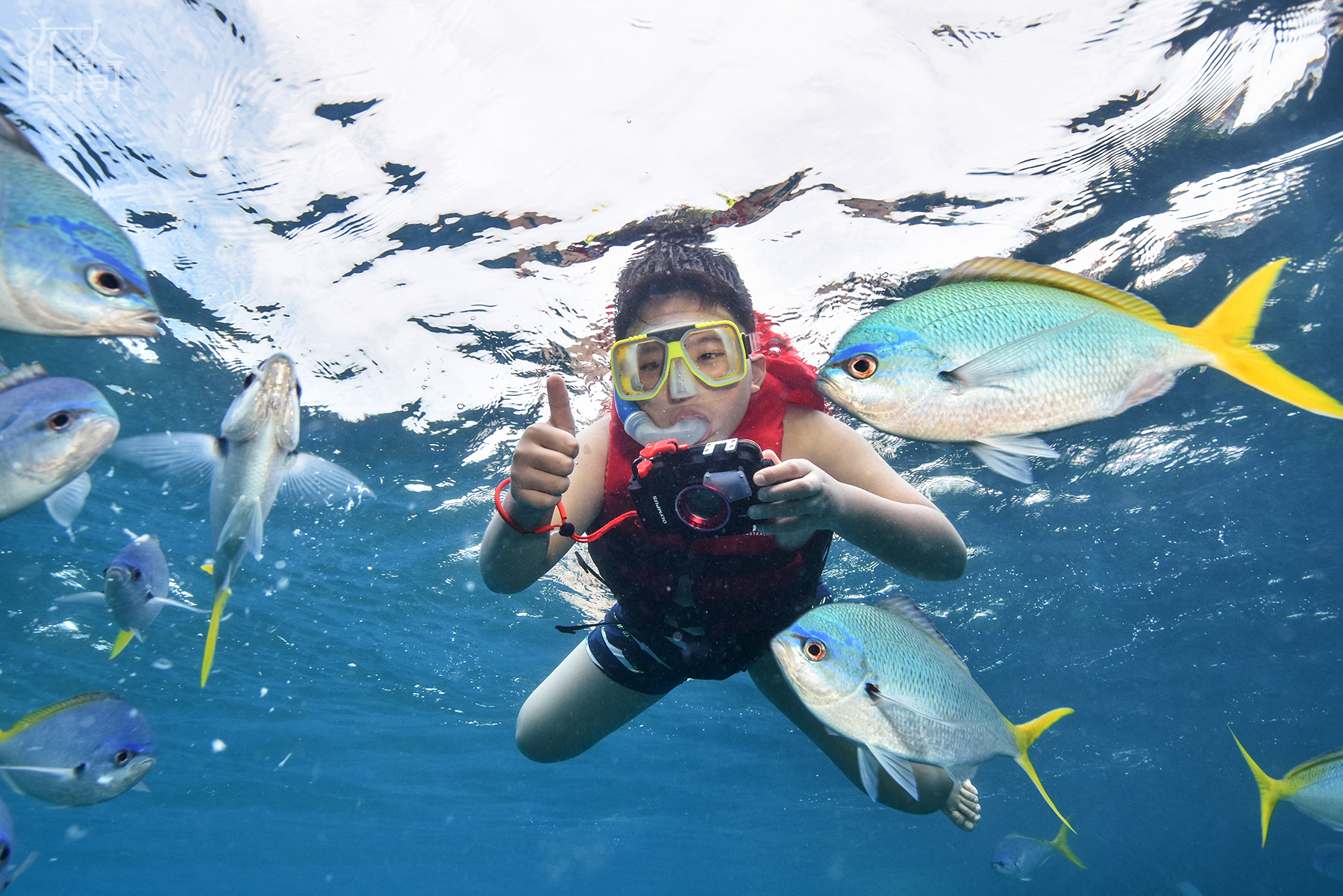 除了博物馆,蓝绿相间的大海也给了他很多欢乐。 还有袋鼠,“袋鼠在澳大利亚已经泛滥成灾了,在房子旁边跳来跳去”,校校开心地比划着。图为2019年8月6日,校校在快要消失的大堡礁畅游(受访者供图)。