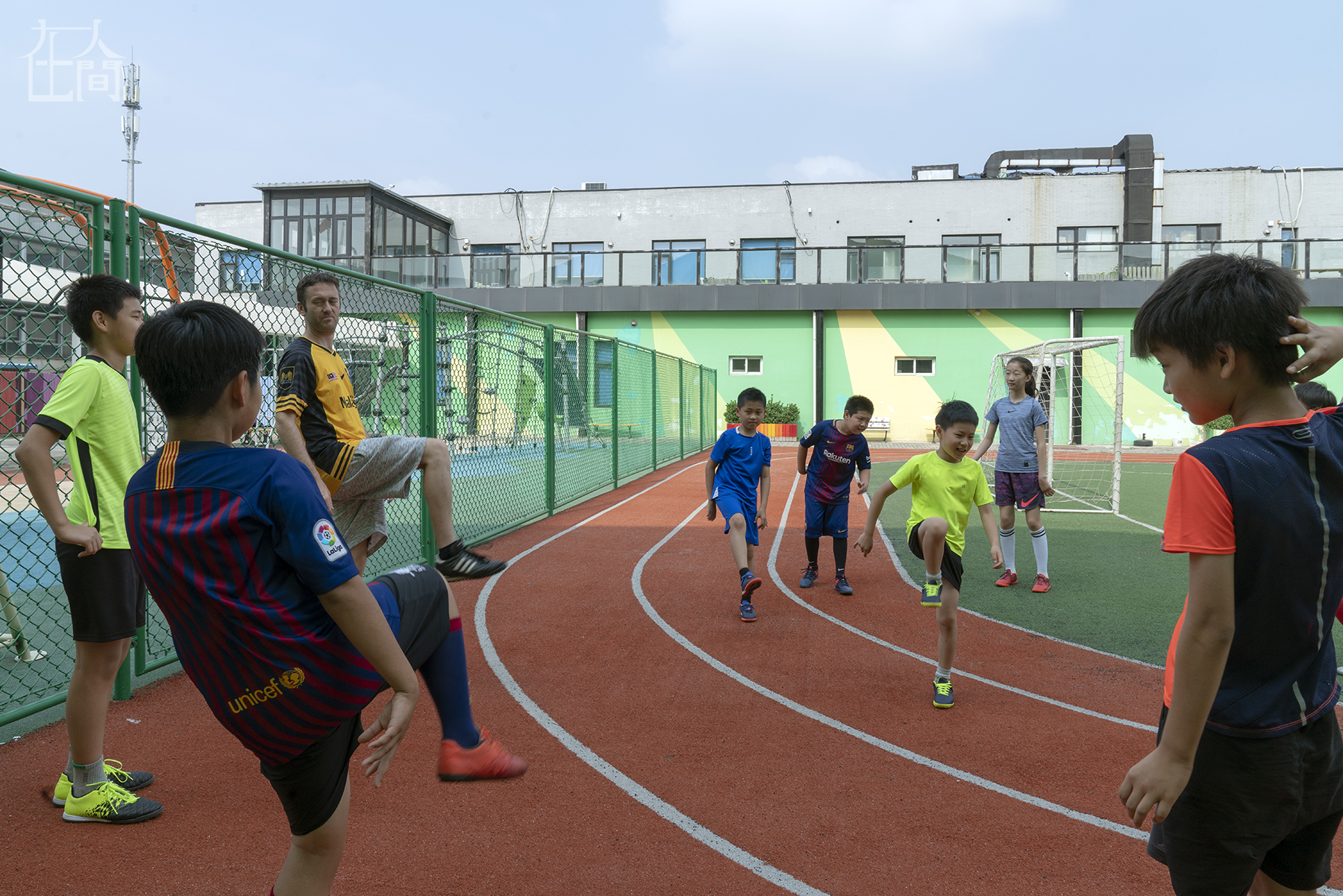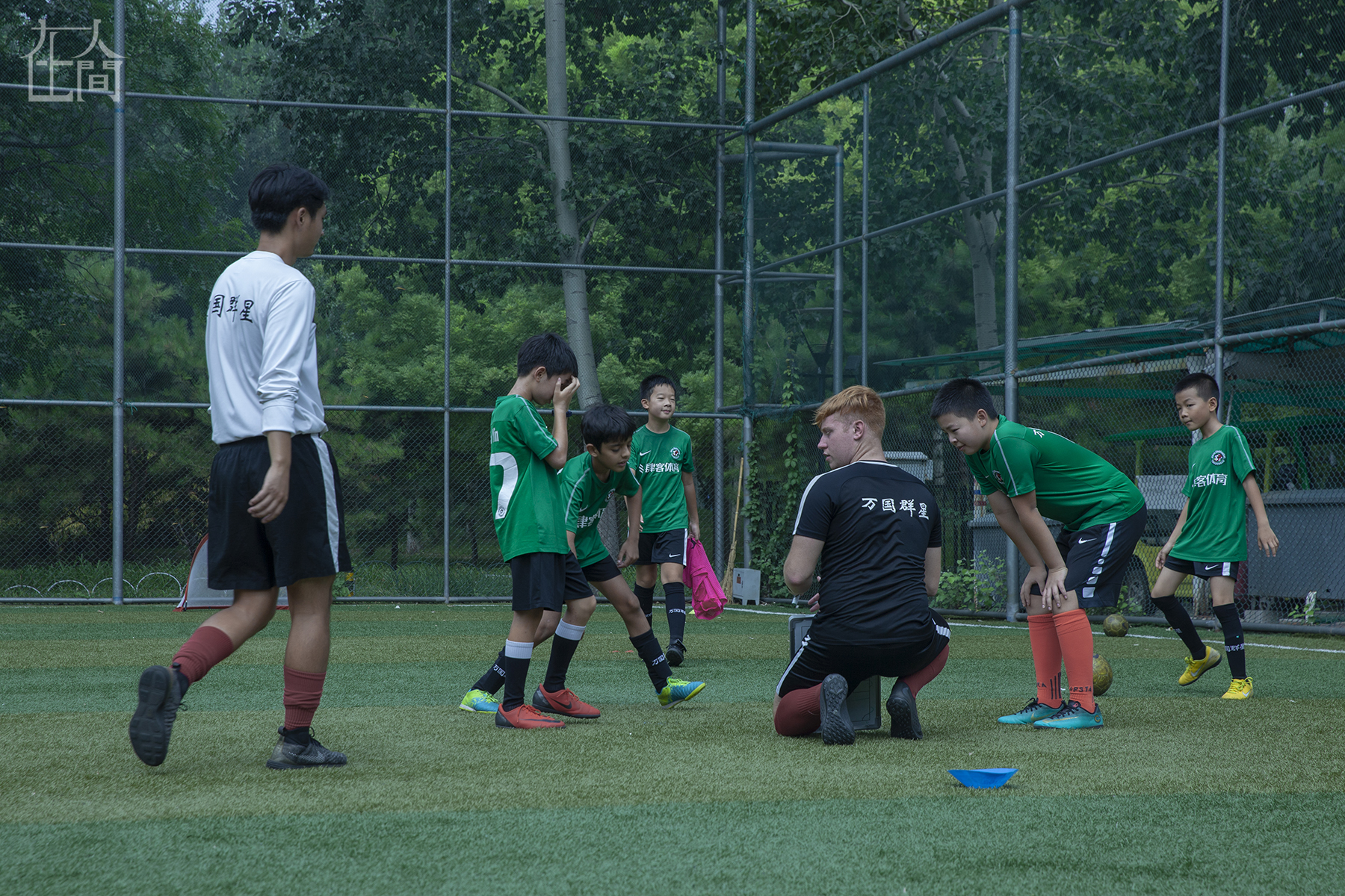 因报名失误,Lucas进入了高年级的训练团队,虽然在队员中年龄和个头都最小,但他看起来像个老球员一样,眼神锁定在足球上,全神贯注寻找对手的每一个破绽,逮到机会就左冲右突。去年Lucas所在的球队参加其他足球俱乐部的比赛,踢了第三名。图为2019年7月29日,Lucas的足球外教正在纯英语授课。