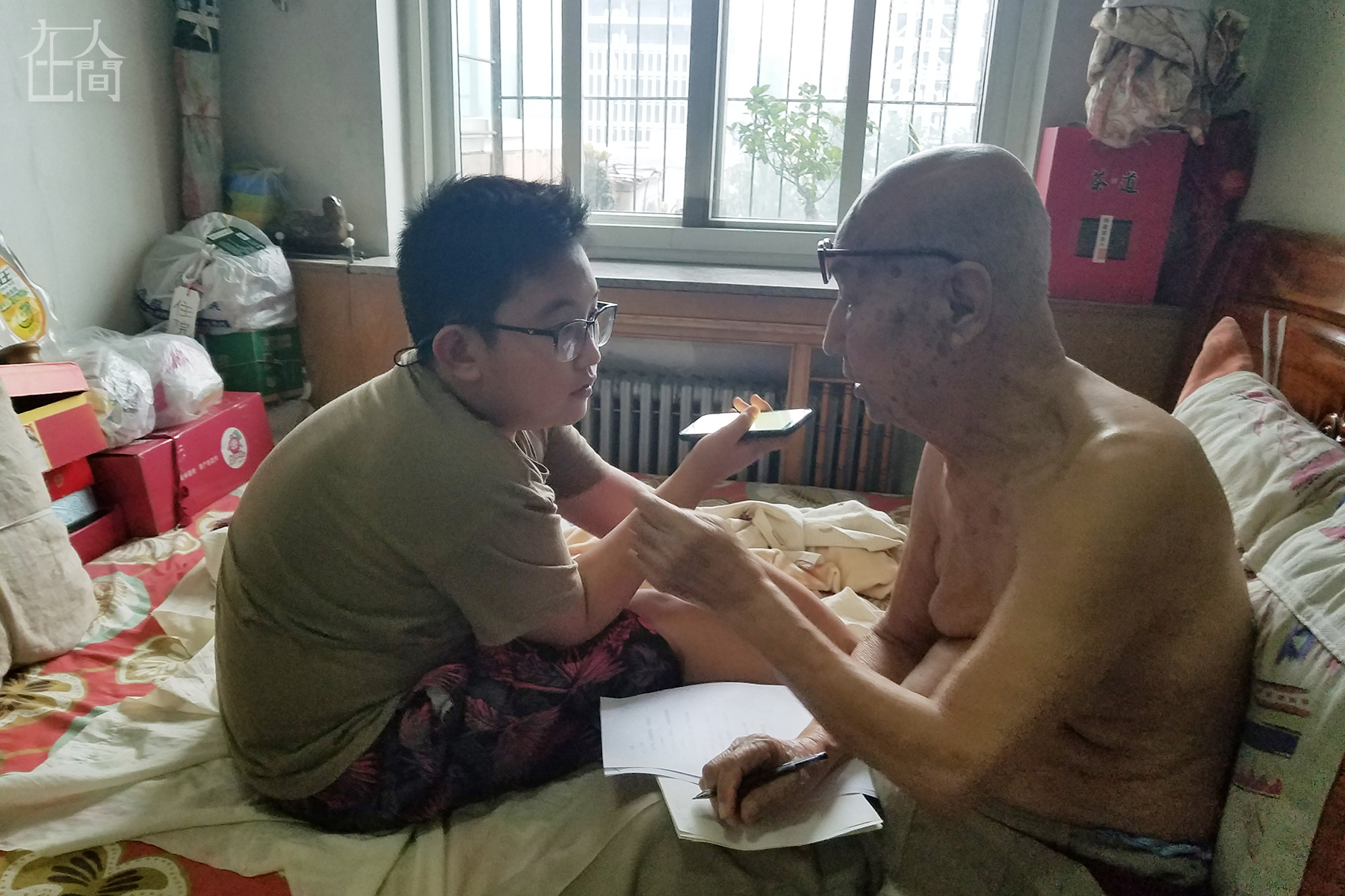 这些课程并不是他全部任务,学校的暑假作业也不少。 古诗打卡24首,英文游记,还要读书写读书笔记等等,校校读的是《林肯传》。假期作文校校写了《我的外公》,他在老师的指导下做调查笔记、列采访提纲,再去找外公访谈、听录音,再在电脑上修改,像个专业的小记者。 校校最喜欢编程,他从四岁开始学乐高拼插,十岁接触python语言编程。三年级暑假参加了三四个比赛,在WER2016世界锦标赛的积木机器人赛获得小学级一等奖,那个假期爸爸带着校校全国跑着打比赛,“两个人都累得爬不起来了!” 图为2019年8月20日,校校正在采访姥爷(受访者供图)。
