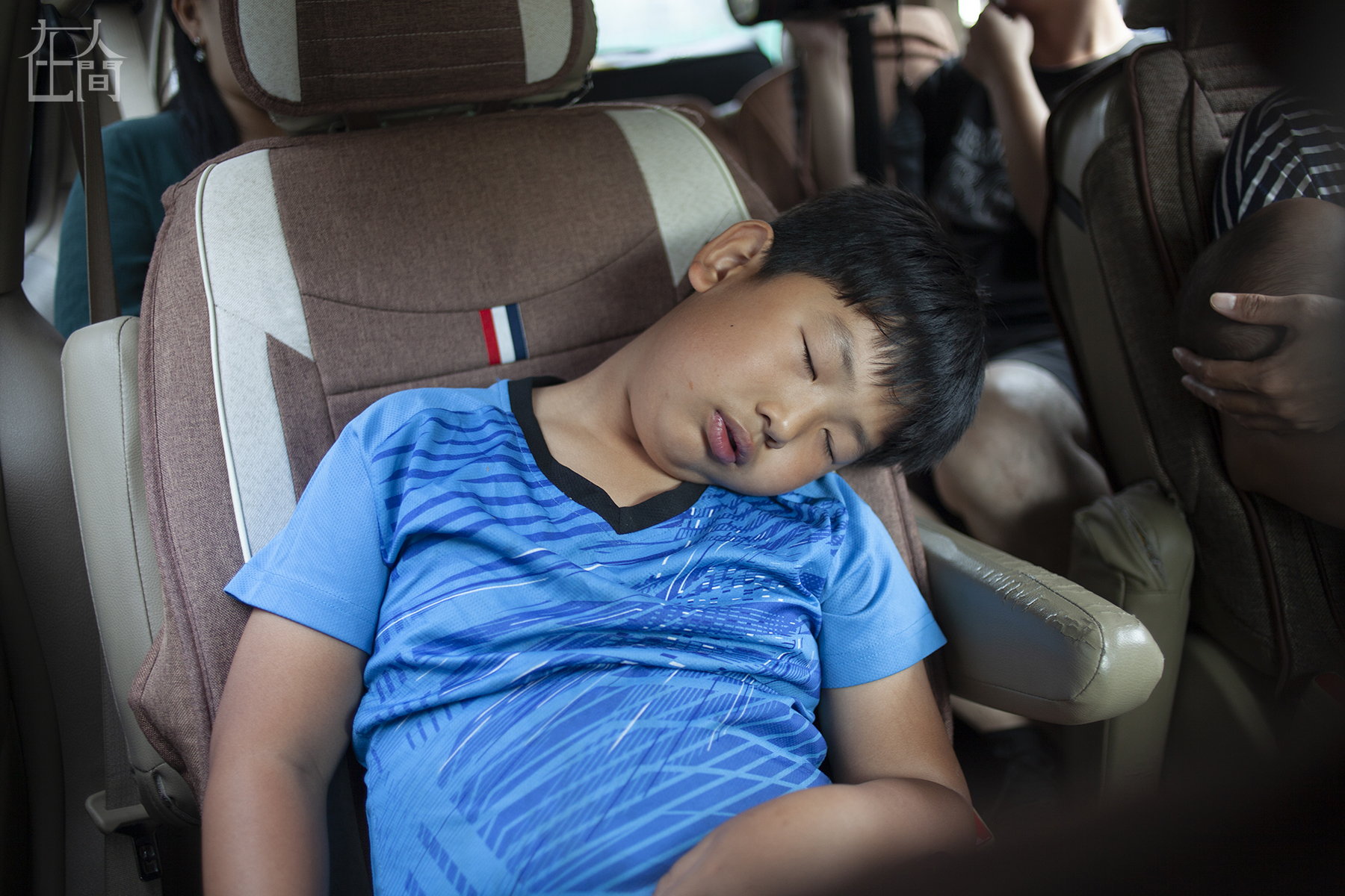 离开学十天,朗朗还有些任务需要完成:十节网球课,四十篇被落下的日记和一些零碎小作业。但是没关系,网球课算是上体育,最难搞的日记也早早被妈妈计划好了,提前买了一台写字机器人,朗朗只要口述就可以把作文写在纸上,效率大大提高,回家的第二天朗朗就写了四篇。其中有一篇写到“在新闻上看到南极冰川的融化对地球的危害太大了,我要爱护环境、节约用水……” 说到玩儿,朗朗有些沮丧,“小区四个要好的伙伴,两个去了欧洲,一个去了日本,还有一个去了云南,其他人也都泡在各种学习活动课上,还没上学有意思。”图为2019年8月19日,从机场回家的路上,朗朗坐上车就沉睡过去。
