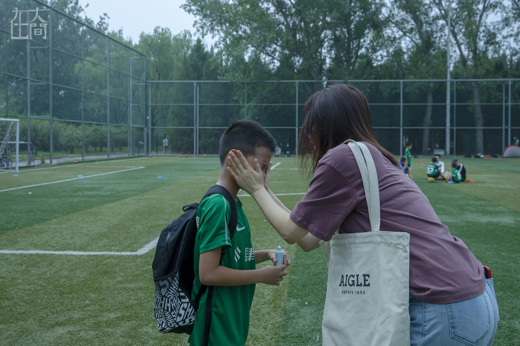 上午9点30分,北京,Lucas来到朝阳公园。今年的北京特别热,七月的白天室外温度基本保持在36-40度,朝阳公园足球场上的塑料草坪从早上八点就开始烫屁股。 但是每周日上午的足球训练依然是Lucas这个暑假最期待的课程。Lucas家距离训练场4.5公里,每周日上午九点父母开车把他送到球场后离开,训练结束时再接他回家。上场前妈妈又在他脸上涂了厚厚的一层防晒霜。 Lucas今年九岁,在一所国际学校读三年级,足球是他最热爱的运动。这个假期每周两节,他没缺过一次,总是准时到场。足球教练是外教,要求严格,训练以比赛的形式进行,Lucas踢后卫,在场上毫不含糊。 图为2019年7月29日,Lucas上场前妈妈又给他图了一层防晒。