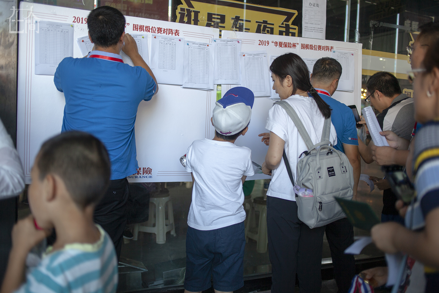 八点半开考,Tim一家八点十一分抵达考场。因北京市内名额有限,三百多名小学低年级的孩子和家长从四面八方赶来六环外的怀柔考区,考场外已汇集成一团不大不小的漩涡,Tim和妈妈一下车就被卷入其中,排队、填表、领证……Tim没来得及吃早餐,直接进场。一边走,妈妈一边安抚着Tim,“你肯定可以考好的,知道吗?没关系的,因为你这几天都很努力”。图为2019年8月17日,Tim和妈妈在围棋级位赛现场。