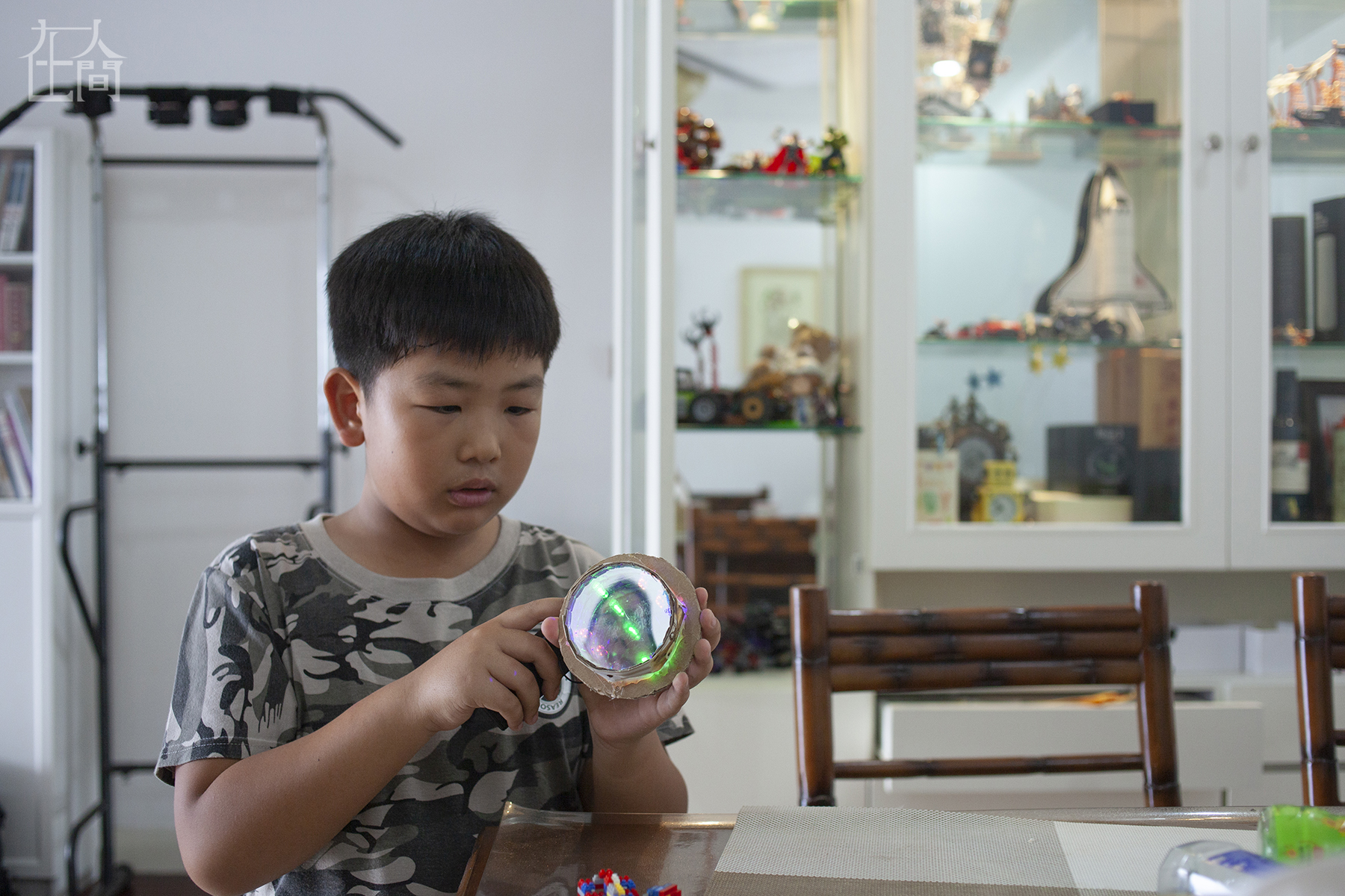 朗朗家的客厅有一列橱柜,上面全是朗朗自己拼的模型,还有编程课做的小玩具。其中用光学原理做的“光隧道”是他的得意之作,“这个是个透明的镜子,然后一直反射反射……就变成了这样子”。打开电源,灯珠变亮,经过镜子的多重反射后,贴在眼睛上看像是进入了隧道。这是他寒假时在科学教室的一个小作业,虽然最终作品比较简陋,整个过程却让他体验到了科学的严谨和魅力。 朗朗家客厅的沙发上靠着一幅油画,是他在美术课上的作品。 “审美不是一朝一夕能培养出来的。”这个暑假,朗朗又报了个故宫摄影课。钢琴也曾是朗朗的必修课。朗朗四岁学琴,但是在7岁左右彻底放弃,如今被打入冷宫的钢琴还在妈妈的书房。回忆起当初买琴的情景,妈妈自嘲:“站在钢琴店里哭,仿佛看到了一颗音乐之星的陨落,觉得全世界都对不起我儿子!”