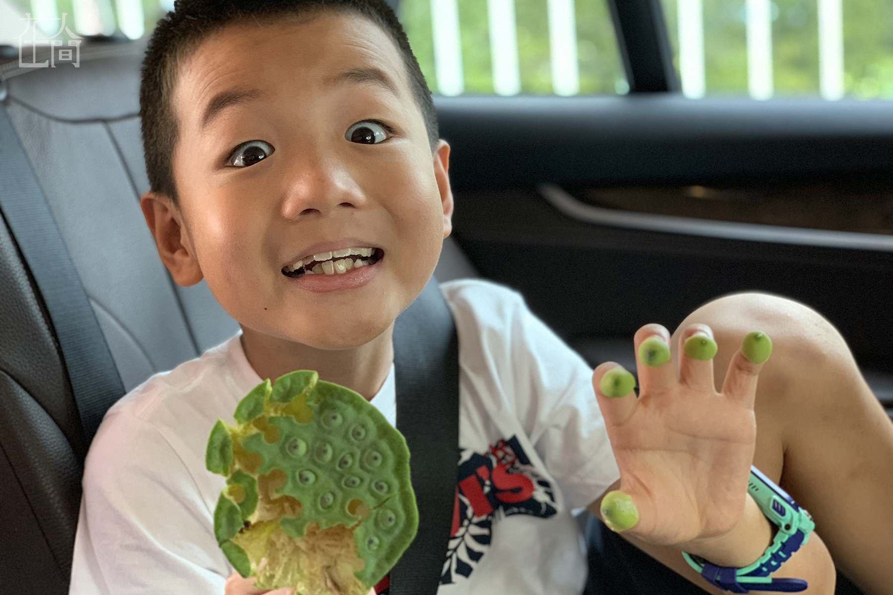 父母对Lucas的学习并没有特别要求,他们尊重Lucas的选择,力所能及提供各种可能,给与他自由思考的空间,看重他的心理感受和学习体验。 Lucas妈妈对孩子课程的学习不是特别在意,“因为不在体制内的学校上学,没有周围环境对我们的要求。我觉得男孩在小学阶段基本还没开窍,我们也不打算强行给他灌输什么,就让他自然而然,他感兴趣了,他想学了,自然会学”。图为2019年8月4日,Lucas到白洋淀摘莲蓬。
