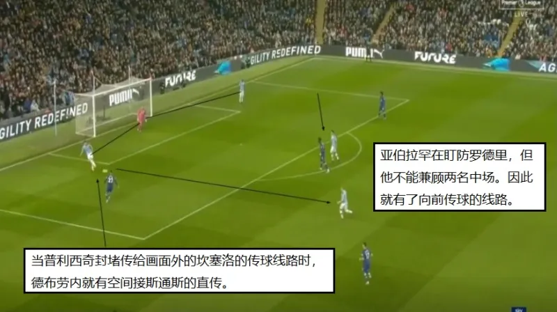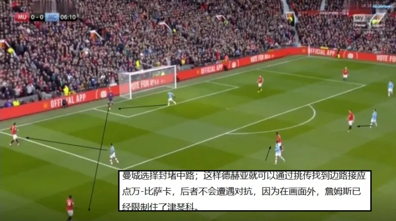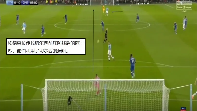 然而,这种方法的一个缺点是,如果使用得有些频繁,那对手也会猜到你的想法,从而冻结住你的威胁。长传找目标中锋的成功很大程度上取决于他能不能拿住球,或将球敲给冲上来的队友。于是,如果频繁使用长传球,对手就有了一个更简单的方法,那就是紧紧盯住目标中锋,阻止控球方保持球权。这也是为什么不能一直使用这种设置。其次,我会考虑将球送往对方前压防线的后方。这种设置是专门针对对方防线的,所以说它非常罕见;如果对方防线很靠前,就可以利用他们身后的空间,用长传球找到一名偷偷潜入对方防线后方的球员。由于直接接球门球不存在越位一说,所以接球球员得球后可以直接与门将单对单。但这种设置一场比赛只能用一次,因为对手非常清楚同样的情景会再次出现。为了完成这个套路,有一名能将球准确开到60-70码外的门将至关重要。他们必须要能传出许多不同的球。曼城的埃德森有这种能力,我们已经在他们的比赛中看见他表演过这种才能。这种球门球设置的主要优点是,如果成功,它将为通常是中锋的接球球员创造进球机会,索命于须臾之间。如果对手的防线后有空间,前锋就可以与对方门将单对单,这有就有了快速将球送往进攻三区,并创造明显机会的方法。我们可以看到,在瓜迪奥拉手下,曼城的埃德森和阿圭罗玩这种策略的次数比其他球队要多。