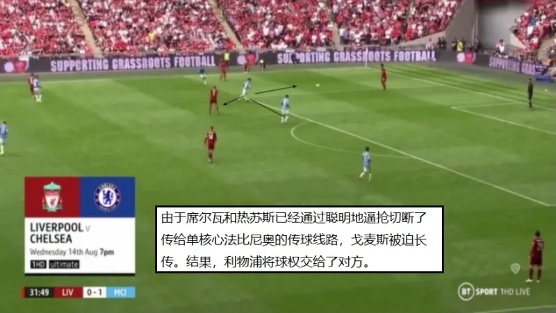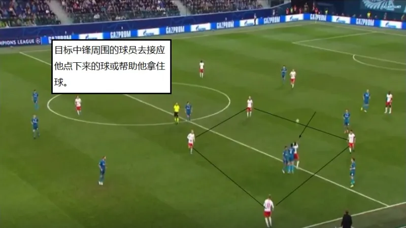 然而,持球方所要面临的一个挑战是,以这种阵型开球门球有潜在的球权转换风险。这种站位非常冒险,一旦球被断下,就只有两名球员在球后方,来阻止丢失球权转化为被进球了。尽管如此,完成这项任务几乎是不可能的,因为一旦对手赢得了球权,球既在中路还靠近球门,对方就会获得一个绝佳的机会,并且很有可能取得进球,因为这个球是防不住的。有一说一,我们在那天看到的瓜帅的这种球门球策略,非常具有进攻性,这也象征着他的足球哲学。还远没有消失的长传球虽然直接向前的长传球出现的频率已经减少,但它还远没有消亡。球门球直接起长传通常远非随便抡一脚;这背后往往是有道理的。首先,我会考虑使用接长传球的目标中锋。这个安排很容易理解;守门员直接起长传到目标中锋负责的区域。为了实现这一点,你的阵容中要有一名目标中锋,还要有一名可以向球场特定区域送精准长传球的门将。球门球快速找到目标中锋的一个优点是,球可以快速进入前场。为什么这是个优点呢?因为实质上它最大限度地降低了在后场丢失球权的风险,一旦在那里发生了球权转换,就会十分危险,而且很难防守。快速将球送到前场,可以让球队整体加速,从而进入球场上更靠前的位置。于是,中场球员就可以来到目标中锋周围,进而增加后者将球敲给队友或拿住后保持球权的机会,因为他们在球附近有人数优势。如果使用这种设置,确保目标中锋周围有一些球员而非孤立无援就十分重要。否则,中锋在第一次争球后还能保持住球权就几乎是不可能的。