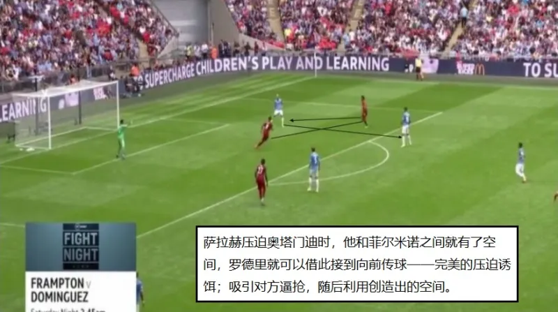 这个球门球站位是瓜迪奥拉在本赛季伊始曼城与利物浦的社区盾杯比赛中使用的。这是自规则改变以来瓜迪奥拉参加的首场竞争性比赛。明显可以看出,西班牙人在这个非常独特的站位中添加了细节。就我个人而言,这是我唯一一次看见这样一种盒型站位,这也说明了这种站位有多么罕见。这种站位的第一个主要优点是门将参与到进攻组织阶段。在对手的压迫下用脚舒服地控球已经成为了门将们的日常,而在这种站位中也需要这种能力。门将在进攻第一阶段充当非门将球员的能力,对球队的整体阵型有着积极的影响。首先,一名中卫可以前提到对手第一条施压线后的位置,这增加了向前传球的选择。同时,另一名中场可以前提到球场上更靠前的位置,在进攻三区影响比赛。最后,这种位置变化让控球方在将球送往前方时,可以有另一名球员进入进攻三区,提供了另一种直传选择。所有这些都源于对门将的使用。第二,与边后卫回撤站位类似,这种体系也鼓励对手压迫。为了对付这种策略,对手可能会选择施压,由于在盒型站位中球员集中在中路,因此球也在中路。于是,对手就会将其视为压迫并在前场赢回球权的机会。然而,在执行过程中,对手的压迫阵型暴露了空间,因此他们打开了从第一条线到第二条线的传球线路。当对手的压迫没有那么紧凑时,从球门球到进攻第二阶段的过程就更简单了。这就是为什么在对手第一条施压线后面安排两名球员这么重要;这样对手就需要覆盖更多的传球线路,于是他们阻断穿过施压线的传球就更加困难,因为要想跟住控球方的移动,他们必须不断折返跑。