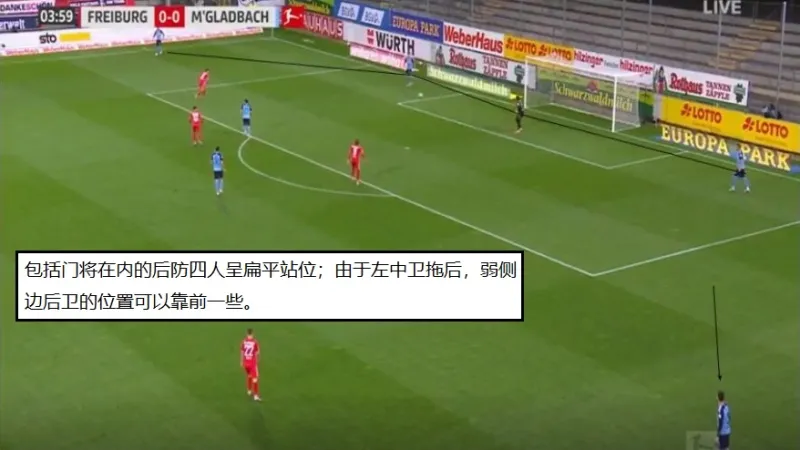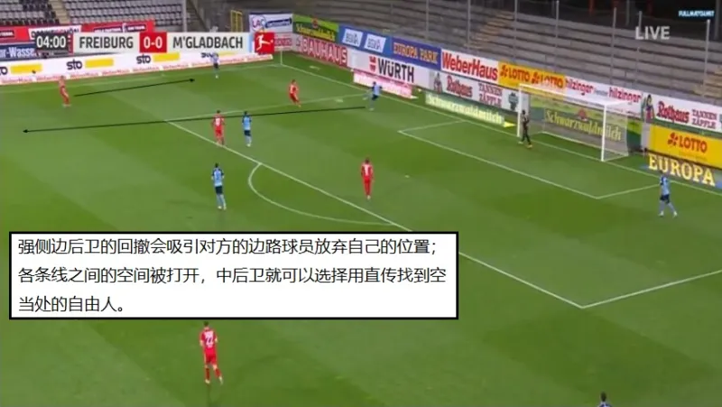 本赛季,切尔西在兰帕德手下使用过这种站位。而马尔科-罗斯在门兴也使用过它,在最近与弗赖堡的比赛中,这种站位十分明显。我们主要通过这场比赛进行分析。边后卫回撤体系的一个优点是,如果对手想要对付这种站位,它会鼓励他们压迫,这叫做压迫诱饵。顾名思义,压迫诱饵是当你控球时,鼓励对手向你施压,而在球场深处控球时,这种情况经常出现。虽然这个策略有一定的风险,如果对方压迫成功球权就发生了转换,但这依然是个优势。因为如果对手为了对付这个策略而真的选择了压迫,那对手的防守阵型就会被拉开,如此,各条线之间的空间,或是可以轻易被利用的防线后方的空间就会被打开。对方很可能会施压,因为边后卫回撤的深度,为他们在极其靠前的位置夺回球权提供了一个绝佳机会,随后他们便可以用这次前场断球获得一个进球的好机会。结果,对手很可能会顾此失彼,拉开防守阵型,暴露各条线之间的空间,后场球员就会有很多机会通过直传找到前场自由人。