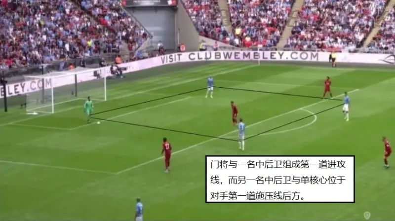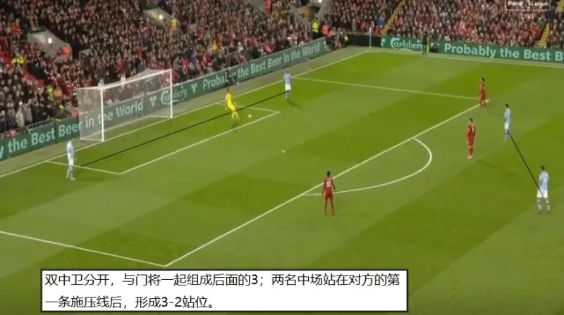 整个赛季,瓜迪奥拉的曼城一直在使用这一球门球站位;这给他们带来的巨大的成功,因为他们持续展现了从第一阶段到第二阶段在防守区域短传出球的能力。我们同样看到曼联、AC米兰和RB莱比锡这样的球队整个赛季都在使用这种站位。这种站位的一个主要优点是,它让两名中场站在位于第一条施压线后的中路。这实质上意味着在中路有更多短距离、向前的选择,这使得将球从第一条进攻线(后面的3)送到第二条进攻线(双中场)的过程更加容易。从防守方的角度考虑,这种站位很难防守,因为要防止球从中路传过去,他们需要覆盖更多的中路传球线路。如果对手第一条施压线上的边路球员去封堵传给拉边压上的边后卫的传球线路,双中场就可以轻松得球。封堵这些传球线路很有可能阻止球向边路发展,然而,这通常会打开中后卫传给双中场之一的传球线路,因而得到了将球送往前方的机会。在第一条施压线后的中路安排两名中场而不是一名,意味着对方中锋很难同时封堵两条传给中场的传球线路。因为在进攻组织阶段通常有一名无人盯防的球员,所以这为将球传给双中场创造了机会。