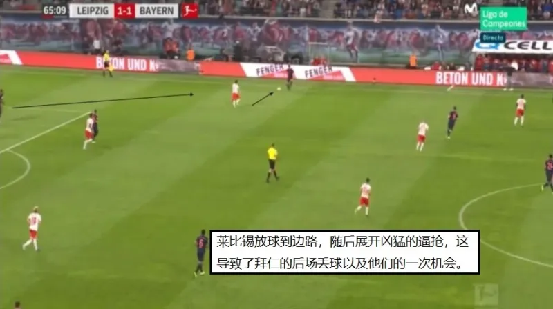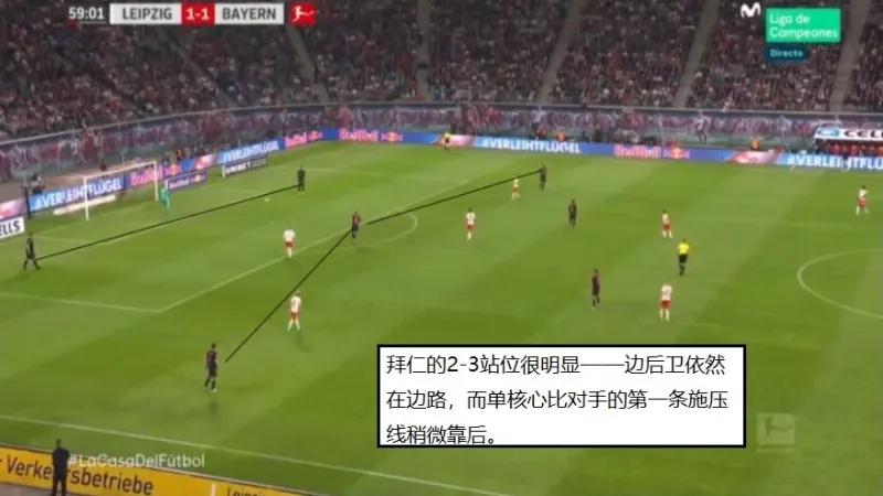 3-2站位的第二个好处是边后卫可以拉边压上。边后卫的这种选位对于3-2站位的成功至关重要;他们通常会压上到比双中场更靠前的平行线上。球员们站在不同的平行线和垂直线上,会带来更多向前的短传或长传选择。这是弗里克本赛季在拜仁取得成功的一个重要原因。在3-2站位下,边后卫可以作为中等距离的接球点。如果对方的逼抢珍惜依然收缩在中路,想要切断中卫传给双中场的传球线路,那么边路区域就会不设防。因此,边后卫可以作为接球点,因为门将或中卫传给边后卫的传球线路还是可以行得通的。边后卫接到球时通常不会遭遇对抗,因为对手的边后卫很容易就会被两边的边锋牵制住。这意味着如果对方边后卫真的决定要压上,并与持球边后卫对抗,那他就会让那一侧的边锋处于无人跟防的状态,因此控球方便有机会迅速将球传向进攻三区,以利用对手的防守人数不足。
