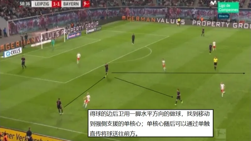 使用2-3站位的第一个优点是,你可以让另一名中场进入更靠前的位置,与单核心站在不同的水平线上。正如在3-2站位的分析中所提到的,将球员安排在不同的垂直线上,对将球送往前方有帮助,因为持球球员总会有许多向前传球的选择。所以让你其他的中场球员前压到比单核心更靠前的位置,可以获得更多中距离传球选择,以进入进攻第二阶段。这在上图中已经有所体现,蒂亚戈和穆勒的站位比单核心基米希更靠前。使用这种站位的第二个优点在于对边后卫的使用。由于只有单核心一个短传向前的选择,因此如果可能的话,球通常都会被开到边路,于是边后卫通常是将球运作到对方半场的重要人物。所以如果球传向边路,为了将球送到前场,我们会看到一些边路配合。通常是强侧边锋回撤,接应边后卫沿边线的传球,并迅速将球还给已经内切到盯防他的球员的盲侧的边后卫。同样,边后卫也可以通过二过一和单核心打配合,先横传给他,再立刻接他的直传。