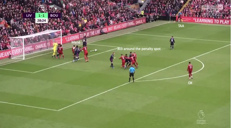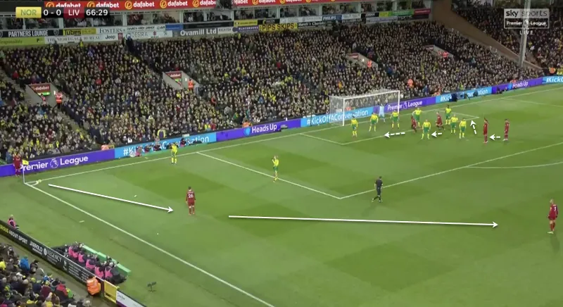 3v3的战斗由交叉跑动和挡人组成,充分发挥大个球员和中等身材球员的优势。范戴克等人交叉跑动,菲尔米诺或维纳尔杜姆等人帮大个队友挡住防守人。这些交叉跑动把对手带往不同的方向,利物浦球员有时一次能挡住多名对手。利物浦通常有4到6名球员在禁区内,禁区附近还有一到两名球员防对方解围打反击。为了使角球战术多样化,有时利物浦会开战术角球,会有一名球员靠近角旗区来接球。开左侧角球时,罗伯逊经常会协助阿诺德开战术角球,如果对方有多名球员上来干扰,那么利物浦往往会选择在距离禁区20米左右的地方多安排一名球员进行接应。如下图所示,诺维奇有两名球员防守阿诺德和罗伯逊,所以球可以传给法比尼奥,由法比尼奥完成传中。诺维奇在小禁区里有四名球员,所以马内和亨德森都跑向近角,试图扯出空间。红军在禁区内有四名球员,范戴克是唯一的大个子,所以他向远门柱跑去,带走三名球员,菲尔米诺则跑向点球点和小禁区之间的区域。整个配合就是菲尔米诺创造机会,阿诺德自自行决定要不要传中,而利物浦几乎找到了无人盯防的菲尔米诺,诺维奇在门将身边的几名球员中只有坎特维尔前来救险。