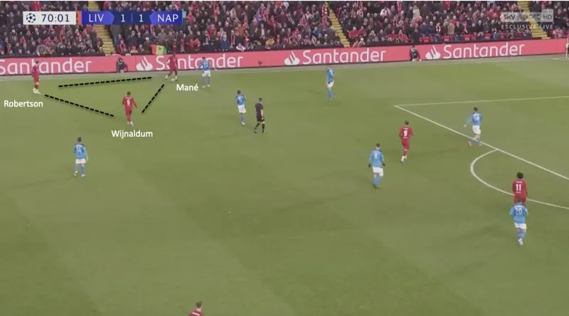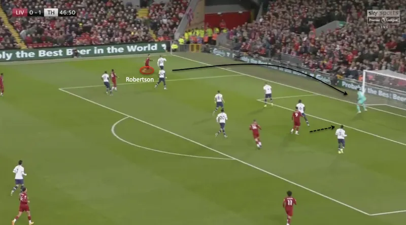 罗伯逊比阿诺德运动能力更强,更能靠速度干对手。他够壮,在高速跑动中也能很好地保持平衡,在对抗中很吃得开。他不是最优秀的盘带高手,但可以在重压下把球带得很稳。他会和马内互动,马内游弋到外侧,维纳尔杜姆也加入进来,三人传球打配合。进攻选择就变得更丰富:罗伯逊像前面所说的那样插对方身后,马内可以向边路或内侧跑动,维纳尔杜姆则去门前包抄。左翼的罗伯逊与队友的配合与阿诺德有明显不同。在右翼,萨拉赫经常内切,为阿诺德创造外围空间,而右中场——通常是亨德森——为两人擦屁股。左路,马内不会像萨拉赫那样频繁内切,而是在罗伯逊有机会传中时向禁区内跑动。在下图这次进攻中,菲尔米诺和萨拉赫一起行动,而马内在拉边。当然,在每场比赛中,马内和萨拉赫都有相当一部分时间出现在中路,但不会一起去。