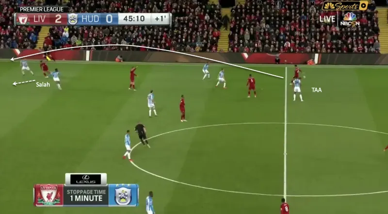 阿诺德在场中会与萨拉赫进行互动,时不时地从埃及人身后插向内线,还可以将球送进对方边卫和中卫防区的结合部,如下图所示,这一幕发生在上赛季对阵哈德斯菲尔德的比赛中。