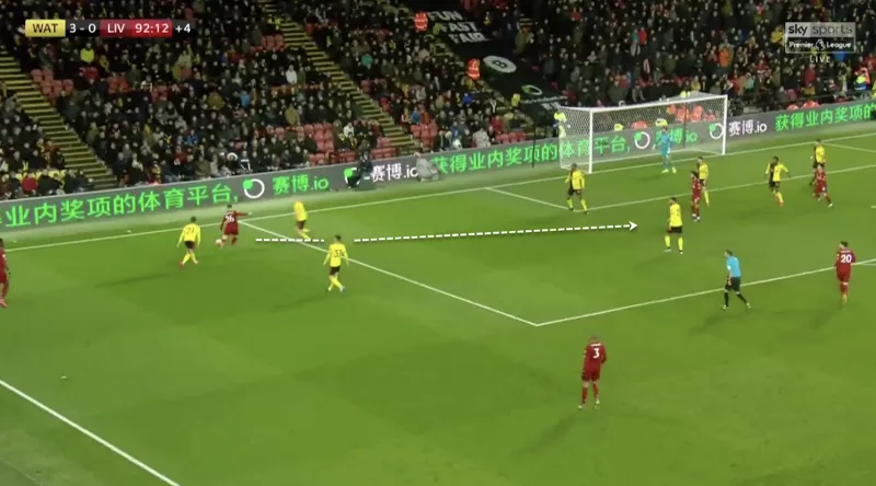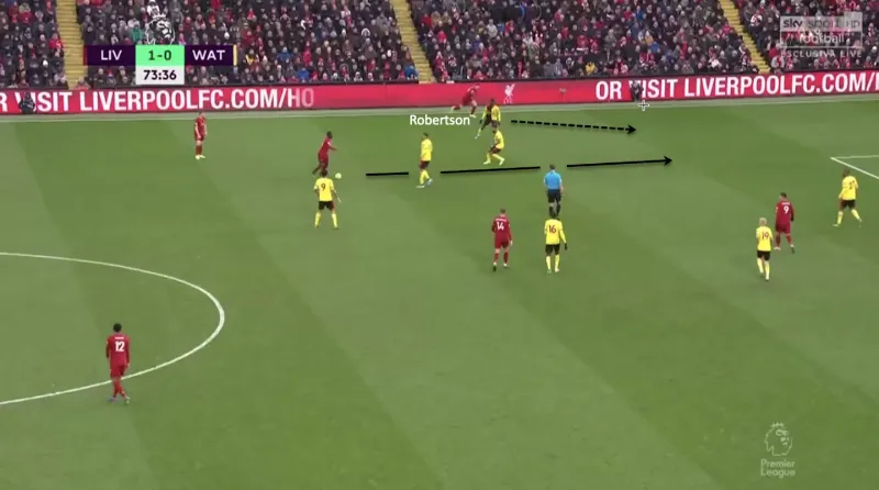 上赛季,阿诺德成为第一位单赛季助攻数达到12次的英超后卫。今年,他有望刷新纪录。罗伯逊罗伯逊是一个比阿诺德更全面的机会创造者,传球脚法了得,其他功夫也很棒。罗伯逊比阿诺德更善于用速度,很多时候,他会在本方半场拿球,然后冲刺推进到前场。在图中,我们可以看到,他插入伊斯梅拉-萨尔身后,穿透了沃特福德的防线。