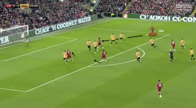 阿诺德阿诺德能从不同角度将球送入禁区——无论球是否处于移动状态,他的传中无比精准,准得不像一名边后卫。他在联赛和杯赛中场均完成7.12次传中,他不断地用传球考验对方的防守。他最常采用的模式是从右路禁区附近向禁区内送出高球传中(如下图所示)。萨拉赫停留在外围,而另外两名攻击手菲尔米诺、马内和维纳尔杜姆一起冲入禁区伺机抢点。尽管利物浦并没有一名高前锋,但在传中送出的那一刹那,利物浦的前锋们在禁区内都有着很好的位置感,能准确找到大部分传中的落点。