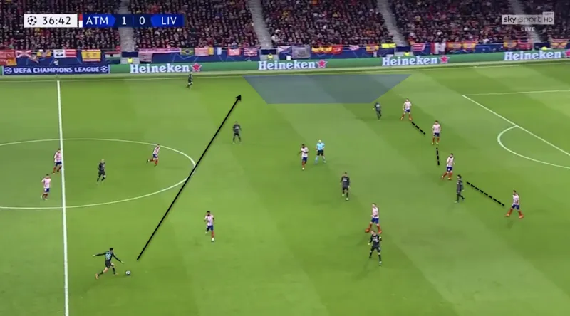 在欧冠1/8决赛次回合与马竞一役中,阿诺德屡屡进入肋部制造机会,而亨德森在其身后补位保护,张伯伦去边路拉开宽度。下图是个很好的例子,可以看到这名后卫实际上是在扮演中场的角色,而中场球员像后卫一样补他身后的位。