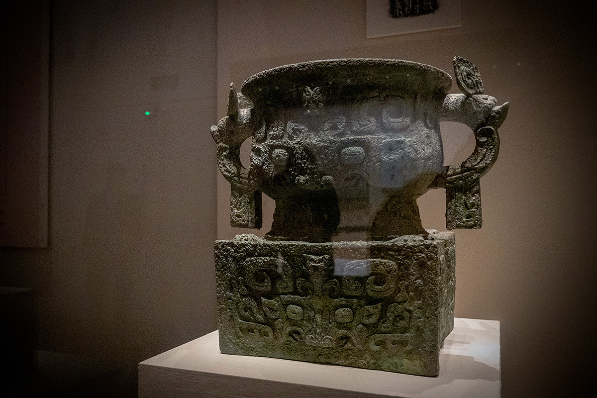 历史书上的四羊青铜方尊,为商代最大方尊。这件文物造型浑厚美观,尊腹为羊的前胸,肩部耸出四个卷角羊头,于宁静中突出动感,可谓匠心独运,值得细细品味。要知道这件国宝曾经在抗日战争中被炸成了20多块,如今修复的几乎看不到破损的痕迹了。