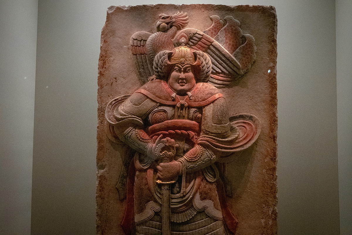 五代十国时期的彩绘浮雕武士石刻,身着盔甲、手持宝剑的武士威风凛凛,且色彩鲜艳保存良好。这件浮雕作品的艺术风格,上承唐代之遗韵、下开宋元之先河,具有很高的艺术价值。