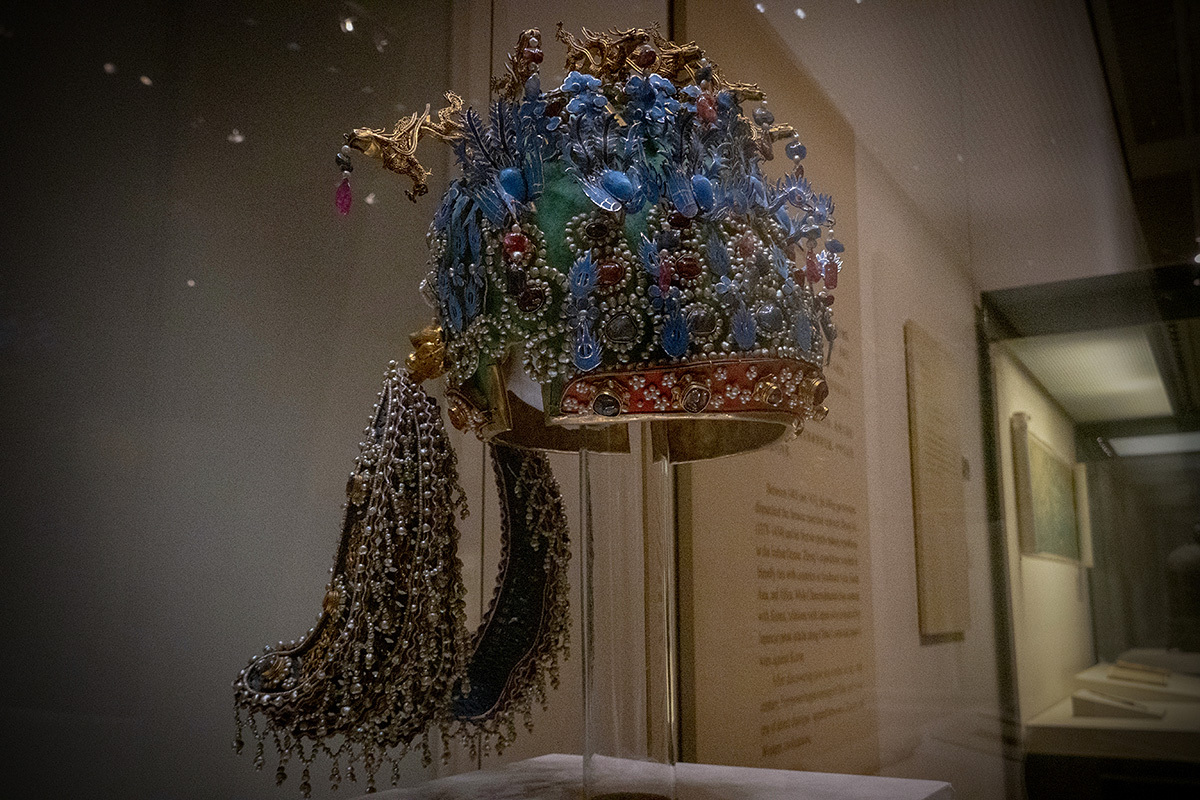 华美异常的孝端皇后凤冠。这件明万历孝端皇后凤冠,用漆竹扎成帽胎,以丝帛为面料,前部饰有九条金龙,口衔珠滴,下有九只点翠金凤,共九龙九凤。凤冠上嵌有天然红宝石百余粒,只能用一个“壕” 字来形容。这些精美的国宝看上千遍也不厌倦啊,如果还没去过国博,那赶紧安排起来。