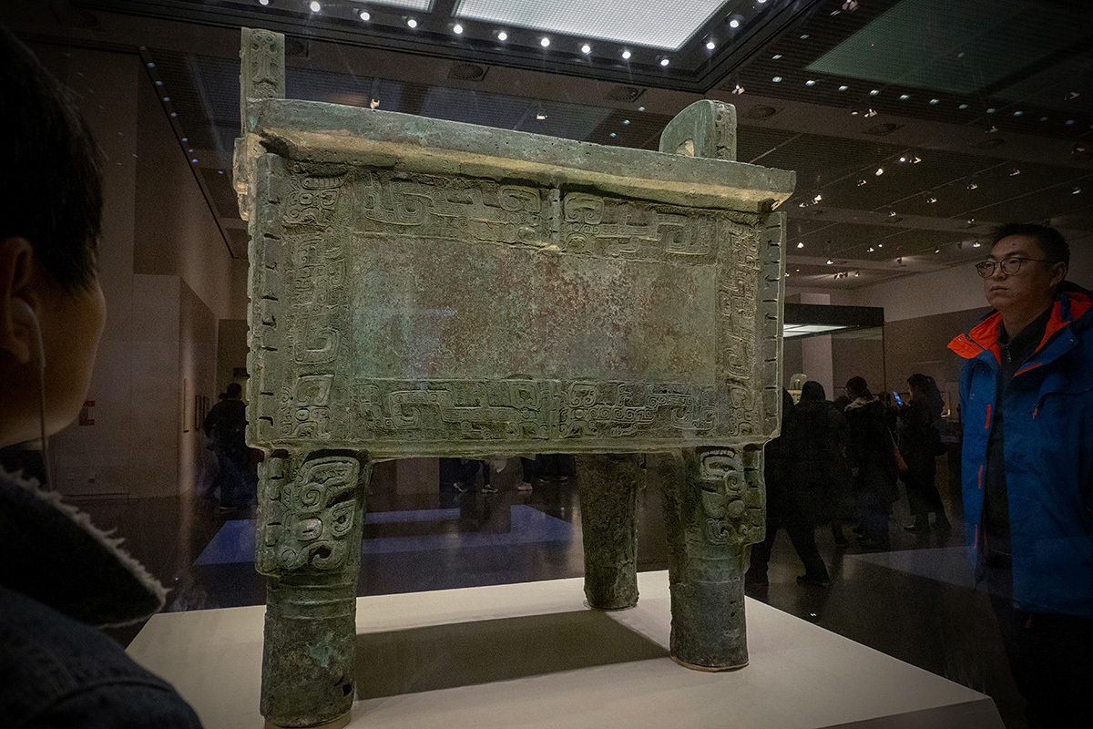 非常巨大,也异常醒目的“后母戊”青铜方鼎,是我国现存最大的古铜鼎,也是商代青铜器冶炼科技的巅峰之作。作为国博最重要的藏品之一,早已被收入到中小学教科书中的国宝重器。此鼎造型端庄、气势堂皇,纹饰精美,有中国第一大鼎之称。