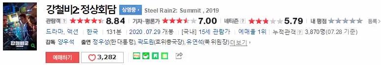 不仅票房火爆,《铁雨2》的口碑也处于中上水平,在Naver平台,观众评分为8.8分,媒体评分为7分,网友评分为5.7分。