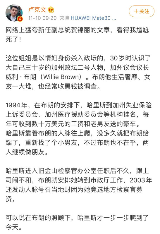 今天,很多人是因为这段八卦才第一次知道威利·布朗的名字。从旧金山地方检察官、加州总检察长,到参议员和副总统,贺锦丽的这么多年来的政治成长,在时间和空间上早已和威利·布朗毫无关系。然而,还是有一些人,非常坚持要用25年前的一段旧事来否定这个女人的全部奋斗。