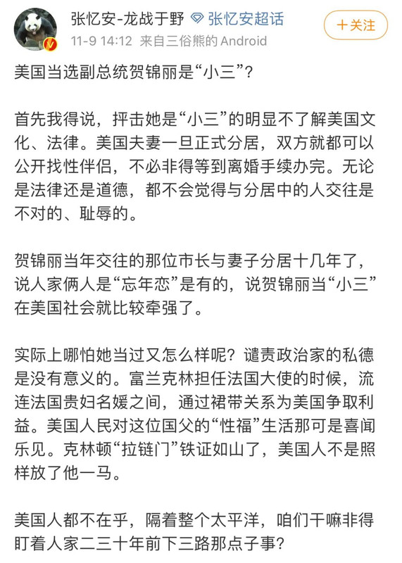 选总统是为了当下和今后的利益,贺锦丽的支持者不会看25年前的记录而投票,其实她的反对者也不会。所以她的“小三”传说更多是右翼和川粉的一种舆论操作,在选前困扰民主党的竞选,选后削弱拜登政府就任的正当性。在中国,她的“小三”传说真是特别满足了一些人的厌女需求,再次制造了打压女性进步的广泛氛围,阻止中国女性因为贺锦丽而振奋起来。而且,通过大肆传播对一个民选政治家的性污名, 这些人还满足了他们总是迫切需要的一种证明,那就是:看,民主政治有多烂。