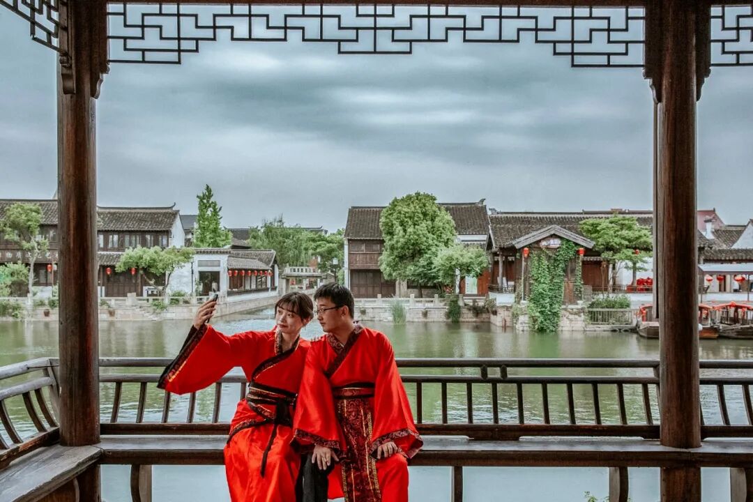 ▲ 从上至下:图1:无锡历史文化街区小娄巷的唯一住户,花为150岁的清代牡丹,摄影/微博@也就那样;图2:荡口古镇着汉服合影的情侣,摄影/归祖玲;图3:锡剧《珍珠塔》剧照。摄影/沈生华