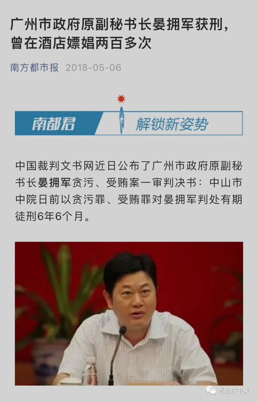 更有意思的是,晏拥军贪污的数额肯定不是最多的,如果扣除嫖资的话,他实际装进口袋的也就是三十来万,这甚至可以说是同一级别的干部里最少的了,但如果考虑到他作为已经落马的原广州市委书记万XX曾经的忠实部下,这也就正常了。