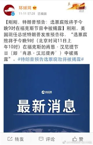 今天早些时候,美国现任总统特朗普发推预告称,“选票腐败将于今晚9时(北京时间11日上午10时)在福克斯的肖恩·汉尼提节目中被揭露。