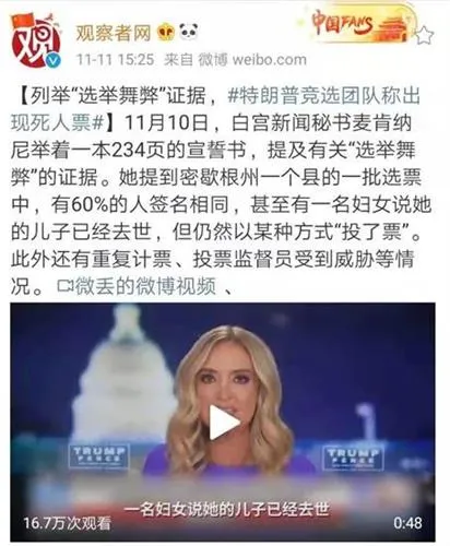 当然,最大的瓜就是白宫新闻秘书麦肯纳尼出示的证据了。她举着一本234页的宣誓书,提及有关“选举舞弊”的证据,其中有死人选票、重复计票、投票监督员受到威胁等情况,密歇根州一个县的一批选票中,有60%的人签名相同。