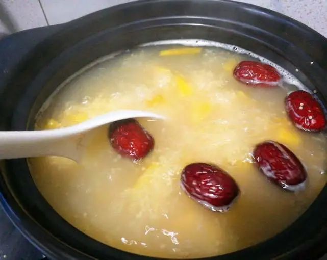 步骤4,大火将南瓜和红薯煮好,然后加上红枣,锅盖不要盖着,将小米粥熬30分钟,等待小米粥熬到黏稠为止。