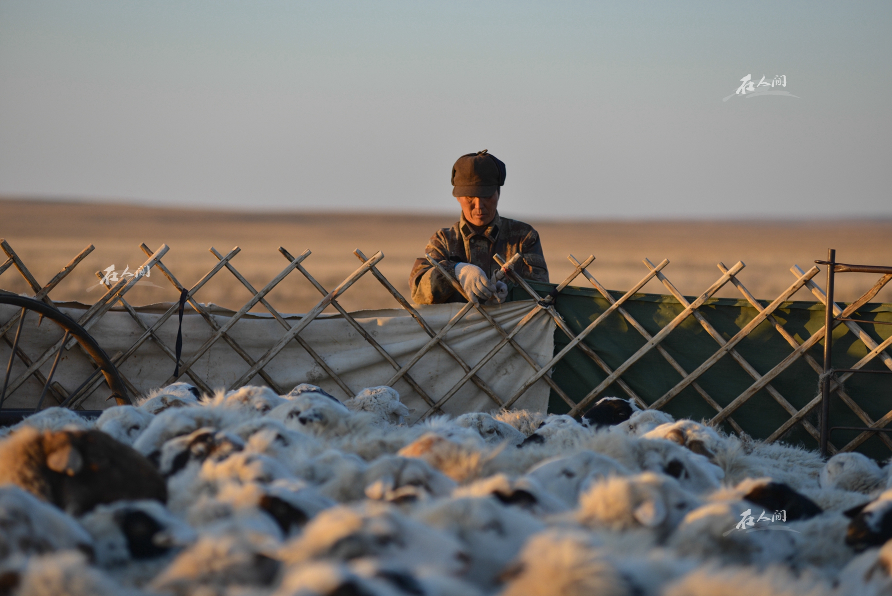 草原上永远有干不完的活,永远也不会闲着。岳父在整理羊圈,草原上的羊圈坏了,他拿了一段不再使用的蒙古包的哈那(蒙古包里的围挡)接起来。
