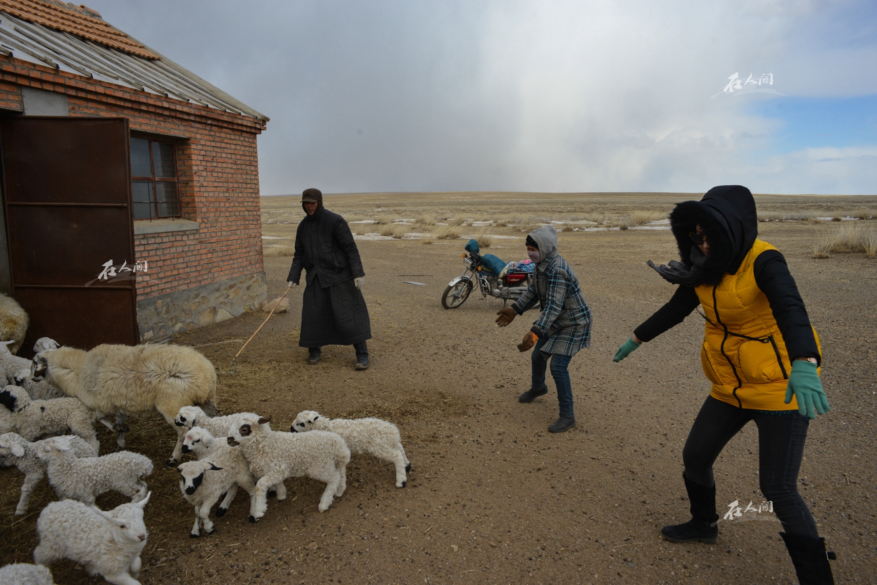 春天,刚刚出生的羊羔在母羊的身后相随。如果跟不上自己的母亲,那么这只羊羔就会不停地寻找自己的母羊。草原上的羊圈在变化,由早先的木质羊圈逐步变为砖瓦结构的棚圈。图为岳父正在把羊群赶入羊圈。