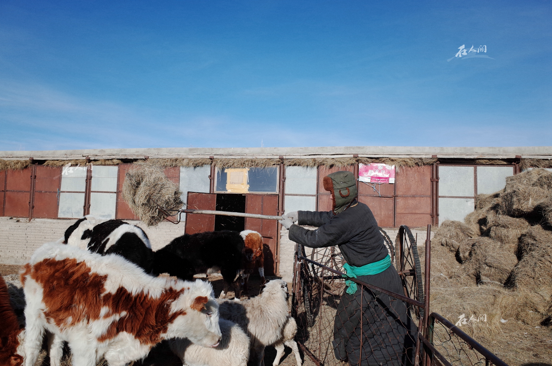 冬天一些体弱多病的牲畜就会被关在棚圈里进行饲养。岳父正给牲畜喂养饲草。