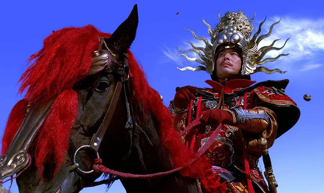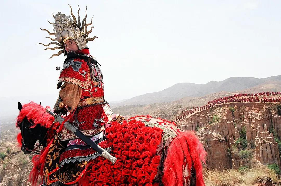 《无极》中,大将军光明身披鲜花盔甲出场,与红色毛发的骏马一同奔驰如风;