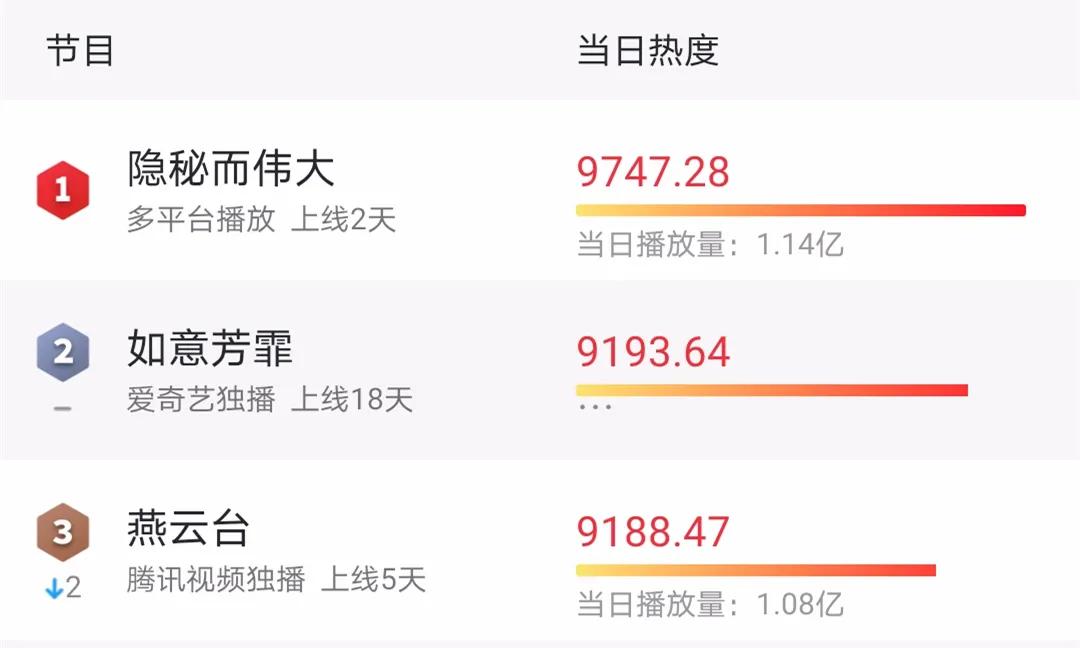 《隐秘而伟大》在开播次日便夺下全网热度榜第一,击败了《燕云台》、《如意芳霏》等热播剧集。