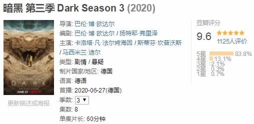 2020年6月27日,《暗黑》第三季终于播出,这一季是最终季,因为是Netflix出品的作品,8集一次性全放出,追起来根本不用等,足以让人过足瘾。